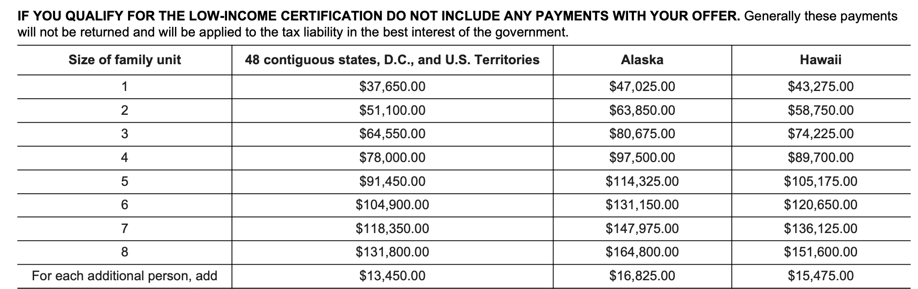You can see how your income compares to your expenses by looking at the IRS’s low-income certification guidelines. You do not need to qualify as low income to apply for an OIC, but the chart can help you understand where you stand.