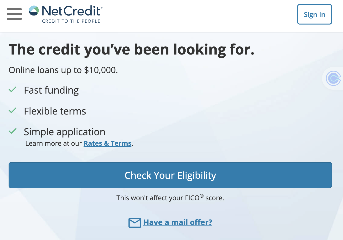 The first step to getting a loan with NetCredit is to check your eligibility, which you can do without hurting your credit. NetCredit will conduct a soft pull on your credit report and let you know whether it can offer you a loan.ย